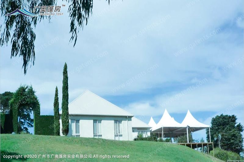 此澳大利亞宴會篷房面積是2000平方米,完全以組合型來達(dá)到客戶的需求。在無場地限制的情況下,按照實際要求,在森林境地下安裝有不帶圍布的尖頂篷房,還有大型的人字形篷房,有著多種不同形狀的篷房組合成一套個性化的宴會篷房。